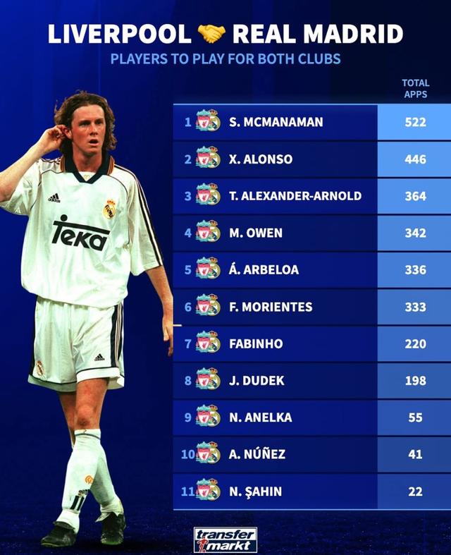 北京时间11月5日股票配资之家,在欧冠联赛阶段第4轮的比赛中,利物浦主场1-0击败了皇家马德里,与此同时德转则统计出了曾代表两家俱乐部出场的11名球员,其中包括了麦克马纳曼、哈维-阿隆索、亚历山大-阿诺德以及迈克尔-欧文。